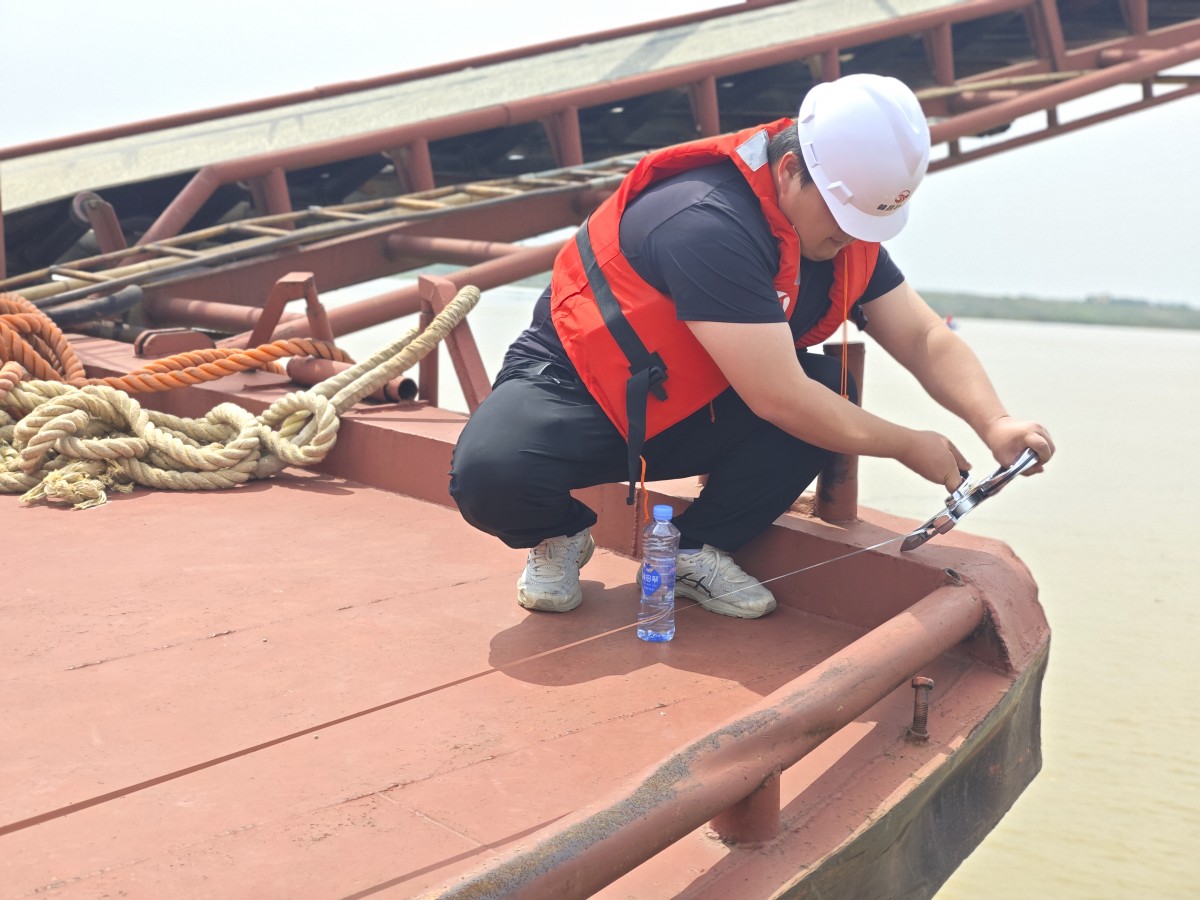 在贛江主支采區(qū)的江面上,一群頭戴安全帽、身著救生衣的身影正頂著夏日驕陽(yáng),有條不紊地對(duì)運(yùn)輸船進(jìn)行著測(cè)量,他們?cè)诰薮蟮拇簧媳寂苤?,工作著。時(shí)間在不知不覺(jué)中流逝,汗水慢慢浸透了衣衫他們卻渾然不知。“這次我們要測(cè)量的船只有40余條,停在主支畫(huà)眉咀上、下游及北支江面上,測(cè)量小組今明兩天必須完成測(cè)量,時(shí)間緊任務(wù)重。”開(kāi)采管理中心班長(zhǎng)張星鵬說(shuō)道。